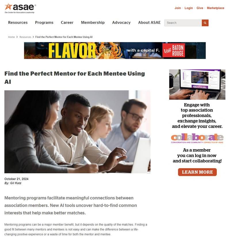 American Society of Association Executives™ (ASAE) article Find the Perfect Mentor for Each Mentee Using AI American Society of Association Executives™ (ASAE), October 21, 2024 By Gil Katz, Director of Operations, MentorEase * Read article >>